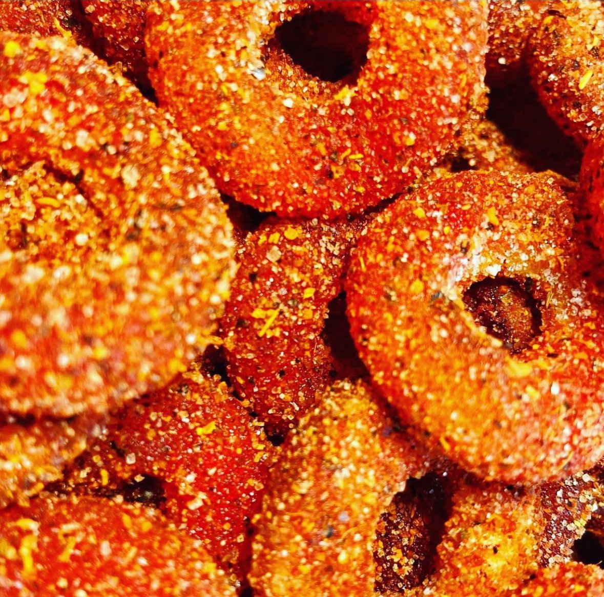 Chamoy Peach Rings Each gummy ring is infused with a mouthwatering chamoy glaze that adds a tangy and savory kick to the sweet peach flavor, creating a symphony of taste